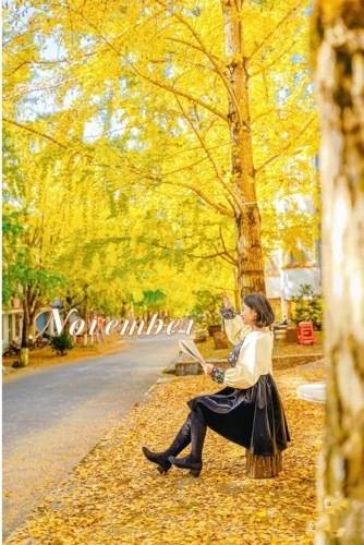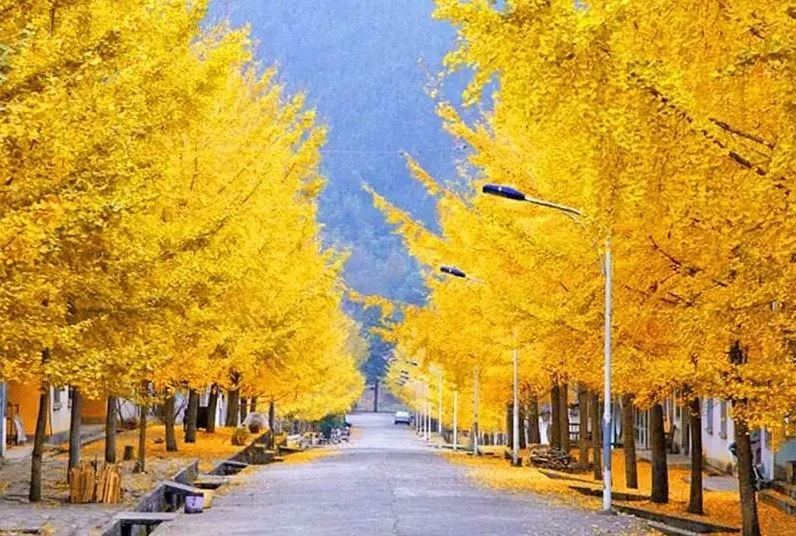 黄金大道,街道边种了两排银杏树,和白色的路灯相配,宛若欧洲小镇,风情万种,金秋的帽子峰,呈现给游客一个五彩斑斓的世界。