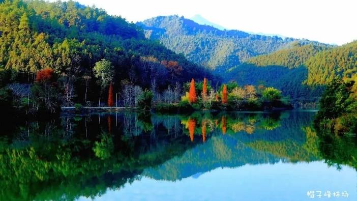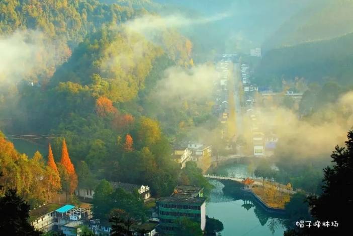 帽子峰林场境内很多地方保留了原始森林风貌,林场四季鸟语花香。金秋的帽子峰,呈现给游客的是一个五彩斑澜的世界。场内人工种植的约700多亩银杏、水杉成熟林,天然成块状、点状分布的枫香林等彩叶树种,叶色由绿变黄、由绿变红、与男波溪流相缺成趣,构成一幅亮丽多彩的“黄杏红枫图”。