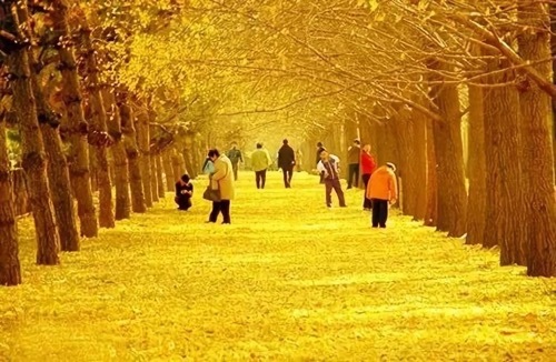 黄金大道,街道边种了两排银杏树,和白色的路灯相配,宛若欧洲小镇,风情万种,金秋的帽子峰,呈现给游客一个五彩斑斓的世界。