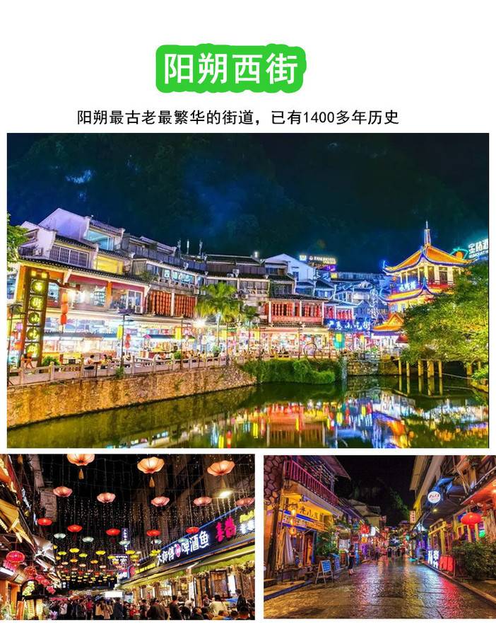 18:30景区停车场集合上车,前往阳朔,全程高速,约1.5小时车程,到达阳朔入住酒店逛西街,泡吧